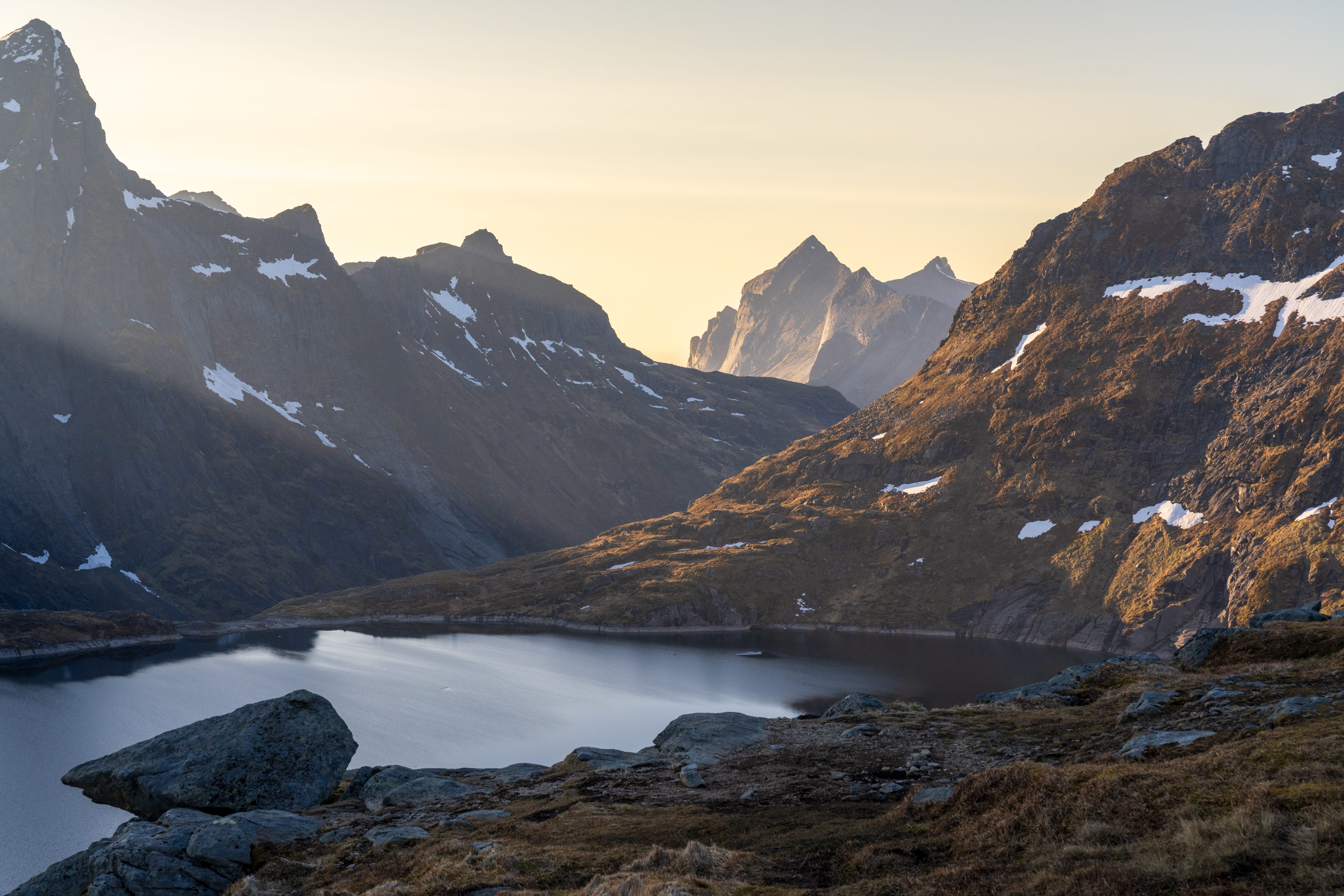 Attorno a me, montagne. A sinistra l’Hermannsdalstinden, ancora in veste invernale, severo e silenzioso. A destra i pendii del Munken, più morbidi, ma non meno presenti. Davanti, una sequenza di laghi — alcuni ghiacciati, altri no — che si rincorrono verso una sorta di finestra sullo sfondo. Una apertura naturale che sembra invitarmi a entrare, o forse a restare.